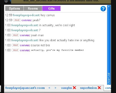 As proof I have included a conversation we had last night, in the midst of my playing Metroid Prime. To Corvus I say, I am honored to be your favorite member and I will keep doing my best to make you proud. What are you doing for Spring Break?