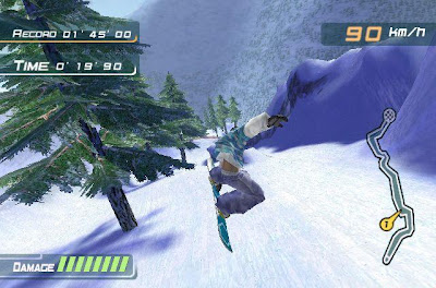 The game focused more on racing. Sure there were trick stages, but the game and stage design revolved around trying to be the first around the finish line. You couldn't get the air that you could in SSX, but you were able to get something else, a sense of speed. When you held down the crouch button, you'd become more aerodynamic. Going down a hill, your speed would increase and bits of snow began to visibly fly by and stick to your parka. The controller rumbled and shook. You really felt that if you didn't hold everything together that you would end up crashing horribly.